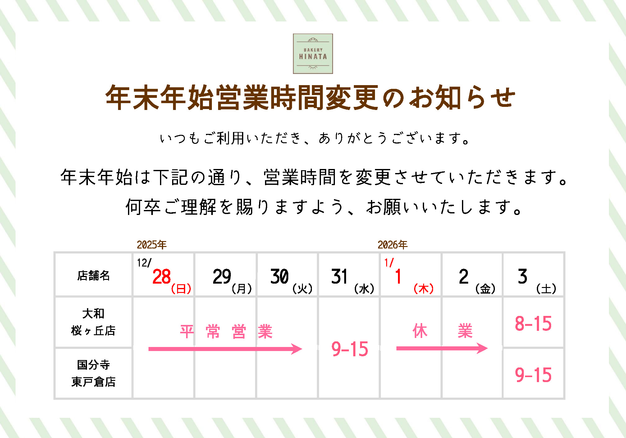 大和桜ヶ丘店・国分寺東戸倉店 年末年始営業時間のお知らせ